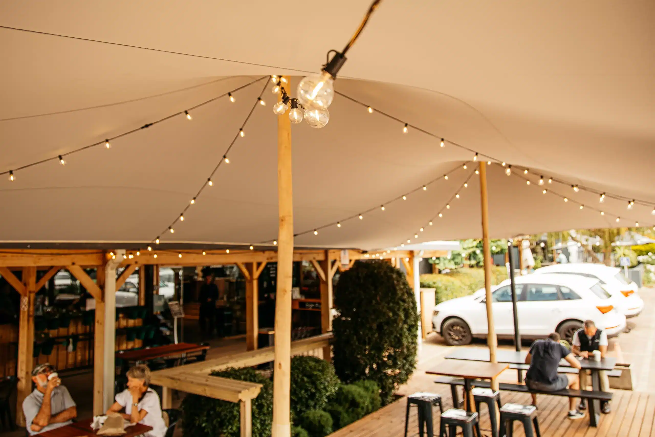 When setting your lights up, you can take advantage of the natural features in your outdoor space to support your festoon lights. Whether it’s a beautiful tree in your garden or a charming ledge on your patio, wrapping lights around branches or draping them along shelves can enhance the natural beauty of your surroundings. When you don’t have these natural structures, we recommend using cup hooks which can be drilled or hammered into the wall, ceiling or wooden panels. We set up our Stellar Lighting Warm White 10m String Lights at the lovely Peregrine Farm Stall and we were instructed to put them up under their gazebo. So we decided to make use of the poles that held the tent up and we wrapped the lights around the pole but to ensure that it stayed up, we secured them with cable ties and TA-DA worked like a charm!