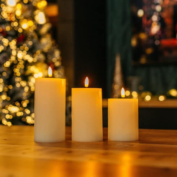 Bring the calm glow of candlelight into your space, without the smoke, flame, or worry. Our White Real Wax Flameless LED Pillar Candle Set brings that timeless charm of real candles, reimagined for modern living. Crafted from genuine unscented wax with a smooth white finish and flat tops for a sleek, contemporary look, these three LED candles radiate a warm amber flicker that feels beautifully real.